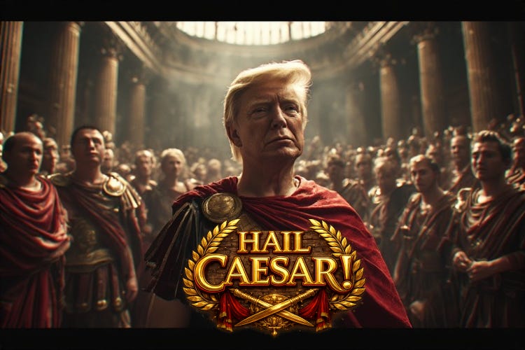 And the man theyâre cheering for is not the one running this. Donald Trump is not Caesar. (Caesar personally led his own armies across Gaul. Trump is a real estate developer whose father handed him an empire at eighteen and whose primary talent is being famous for being famous, a skill he shares with roughly half the cast of any show currently airing on Bravo.) Trump is the puppet. The audience watches the puppet. The hand belongs to Elon Musk, Peter Thiel, and Silicon Valleyâs billionaire class, and what theyâre building has had a name since 1933.