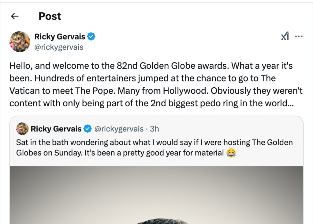 But Gervais is the doorway. What is on the other side of that door is the actual subject of this article, and it is something so old and so vile that most people shut down when they hear it. I am going to say it anyway.