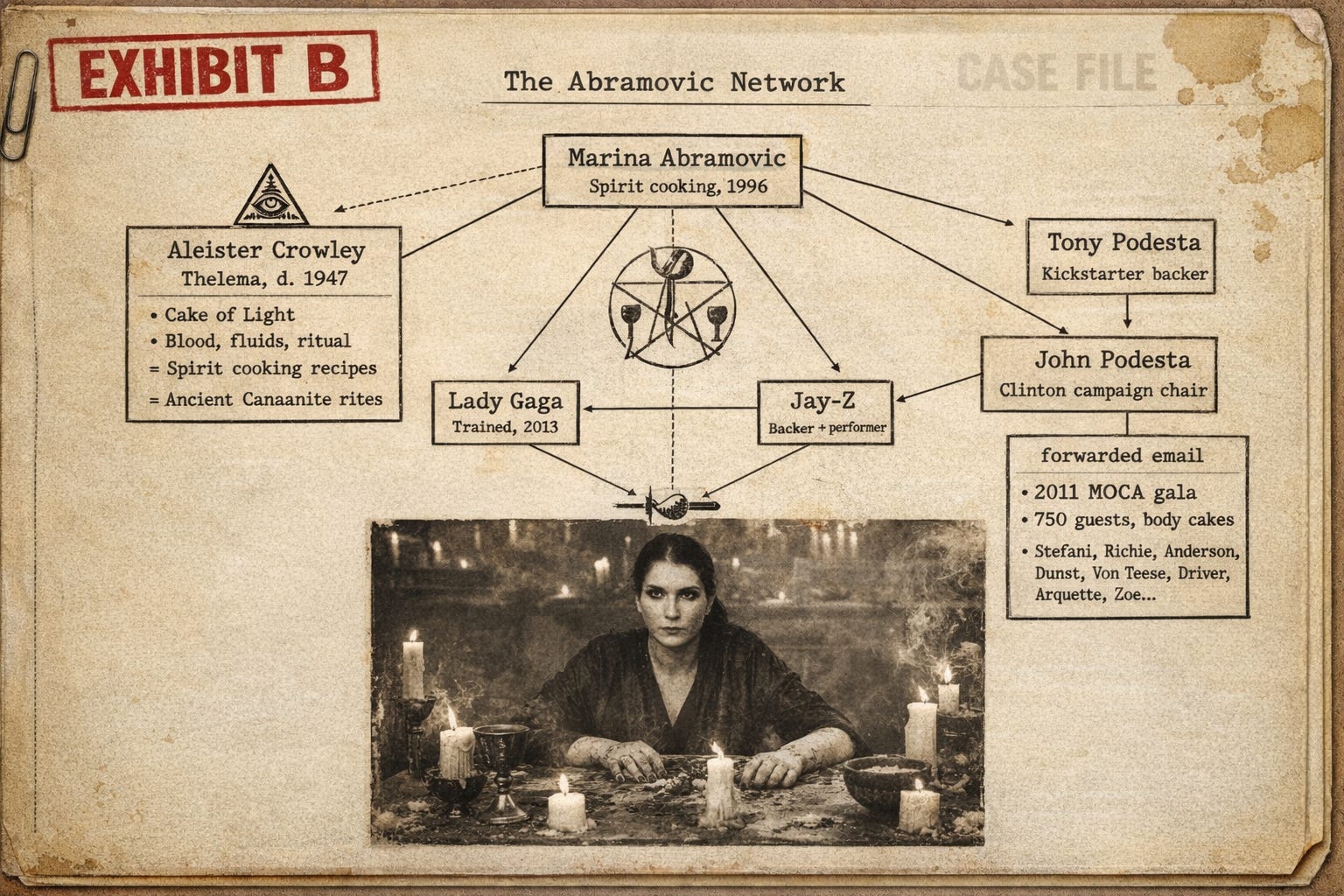 (These connections, Wills would note later, are all publicly documented. They are not hidden. Lady Gaga’s collaboration with Abramovic is on Wikipedia. Jay-Z’s Pace Gallery performance is covered by the New York Times. The Podesta email is in the WikiLeaks archive. The Crowley parallels are in Abramovic’s own published recipes. You can verify every line on this chart with a search engine. That is the part that does not compute.)