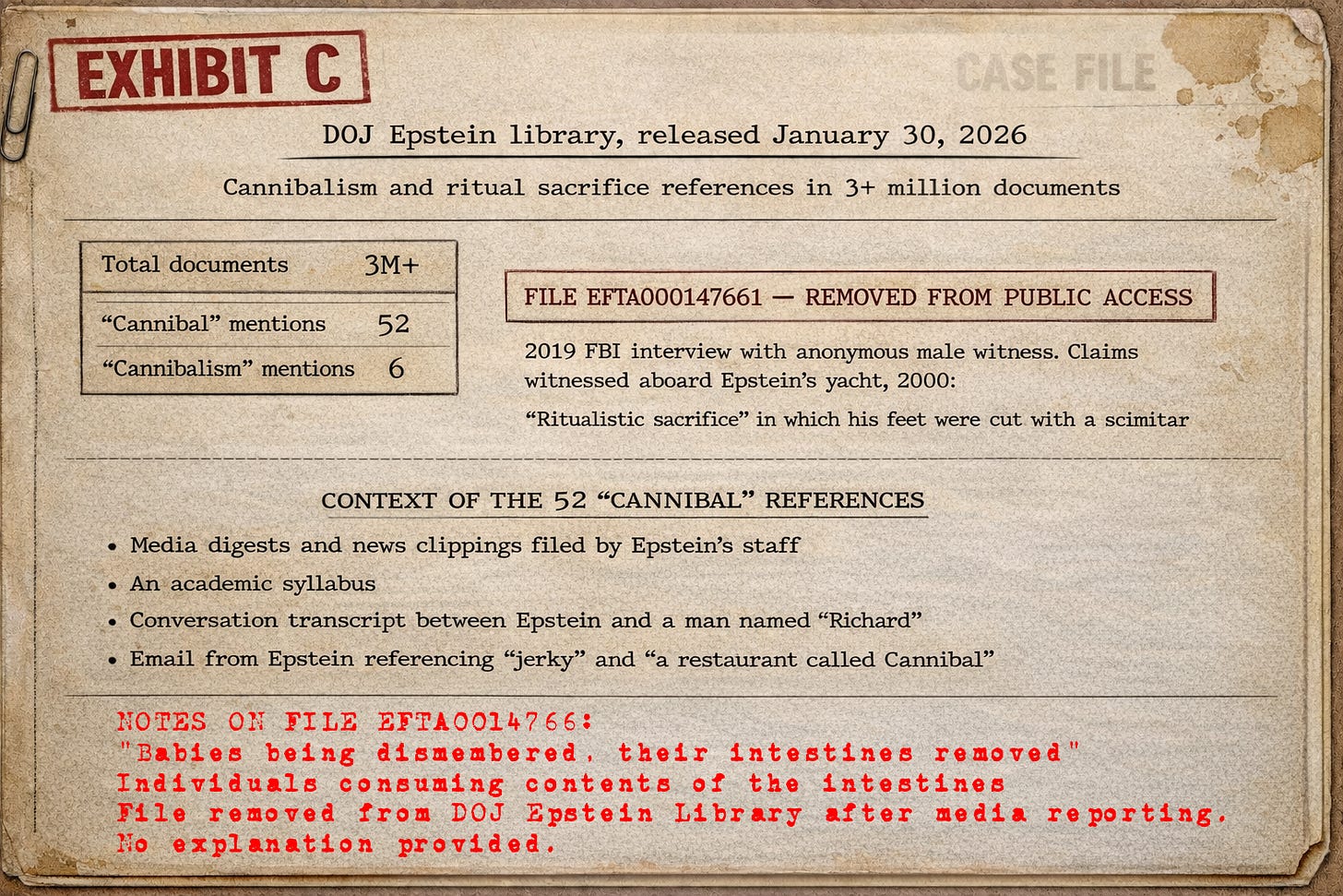 He opened the binder. He read it. All of it. The emails. The photos from the MOCA gala. The Podesta invitation. The Abramovic quotes. The Dawkins tweets. The Newsweek article. The Swedish professor. The New York Times Style section. The Epstein files. The fifty-two mentions. The deleted FBI interview. The body cakes dismembered with cleavers at Table 63.