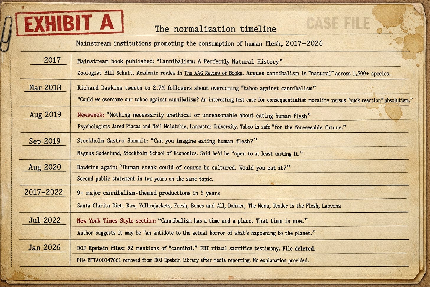 “Or trends follow instructions. A zoologist writes the academic justification. The world’s most famous atheist tweets the philosophical permission slip. Newsweek provides the mainstream on-ramp. A Swedish marketing professor (not a scientist, Arson, a marketing professor, a man whose job is studying how to change what people find acceptable) tests the public’s gag reflex on live television. Hollywood floods the zone with cannibal content until the audience stops flinching. And the New York Times Style section prints the benediction: cannibalism has a time and a place, and that time is now.”