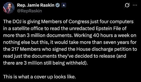 Four computers. The Department of Justice gave Congress four computers to review three million documents. Two hundred seventeen members signed the petition demanding access. Working forty hours per week doing nothing but reading, it would take them seven years. Meanwhile, three million more documents remain hidden.