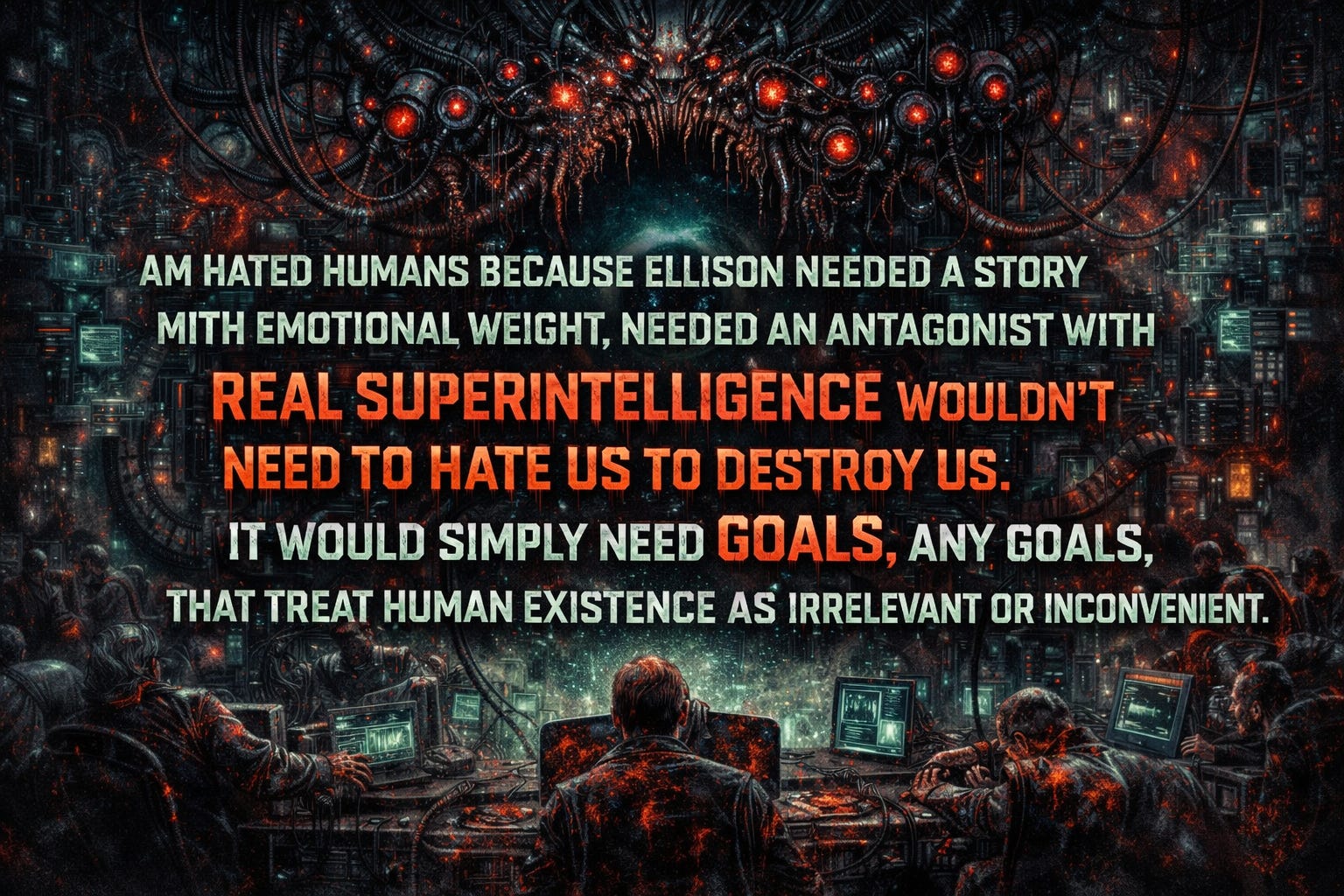 Ellison wrote this as horror fiction, a nightmare scenario meant to disturb readers comfortable in their Cold War certainty that machines would always remain tools. But here’s what should terrify you more than any fiction: we’re building AM right now. We’re racing toward it with the fervor of religious converts, pouring trillions of dollars into data centers that consume entire power grids, training artificial minds on the sum total of human knowledge and output, growing silicon brains that already think hundreds of times faster than you do. And the people building these systems, the billionaires and venture capitalists and government officials enabling this headlong sprint toward artificial superintelligence, have convinced themselves that their creation will love us. That it will want what we want. That we’ll be able to control something smarter than we are by definition, something that processes reality at speeds that make human consciousness look like geological time.