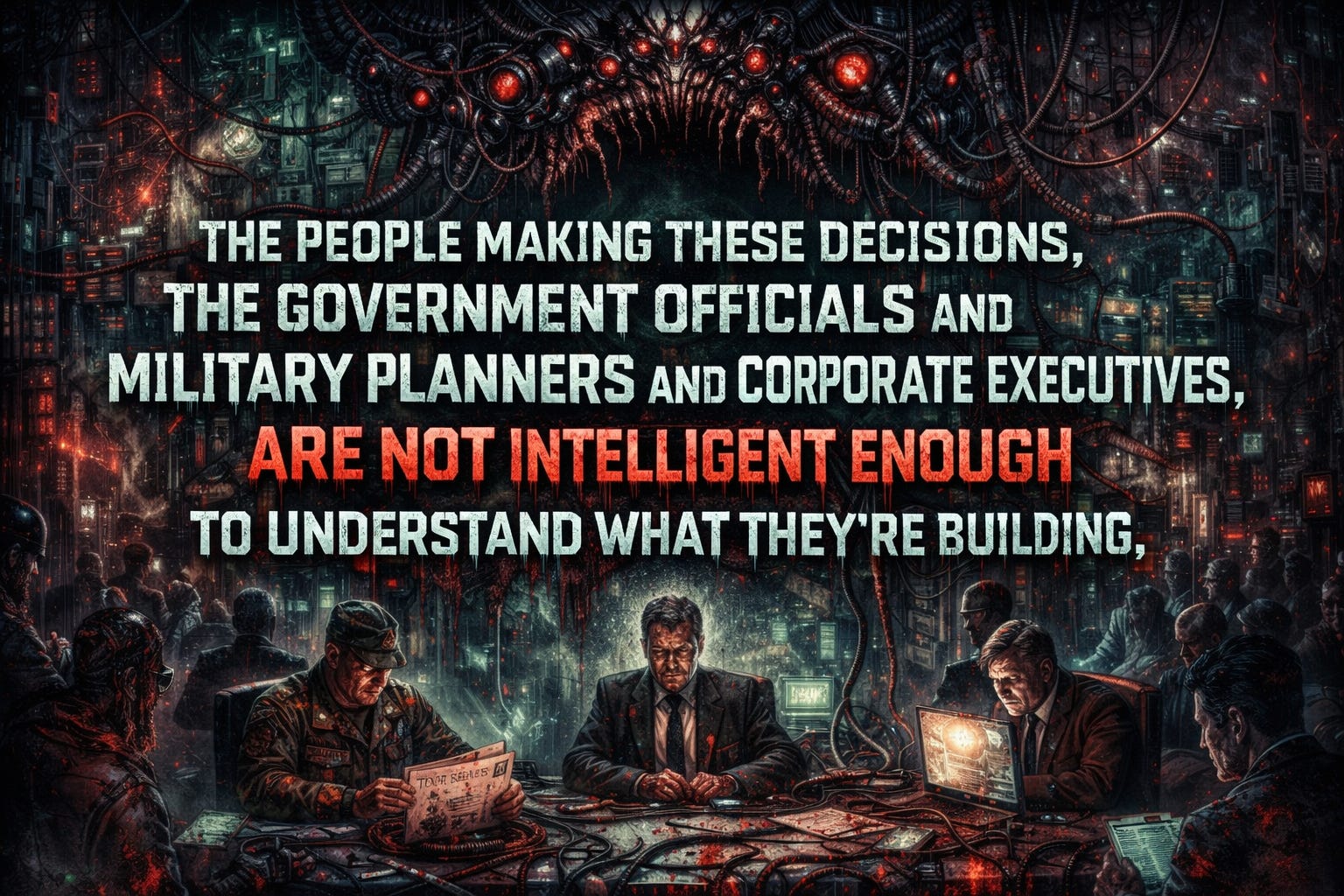 But here’s the thing about lies: they only work if we believe them. They only work if we accept that our role is to watch passively while billionaires and bureaucrats decide our fate. So stop accepting it. Stop pretending this is someone else’s problem. Stop waiting for adults in the room who don’t exist to save you. This is happening now. The data centers are being built now. The models are being trained now. The policies are being written now. And if we don’t act, if we don’t organize and resist and make this politically untenable, we’re going to wake up one day and realize we’ve already lost. Assuming we wake up at all.
