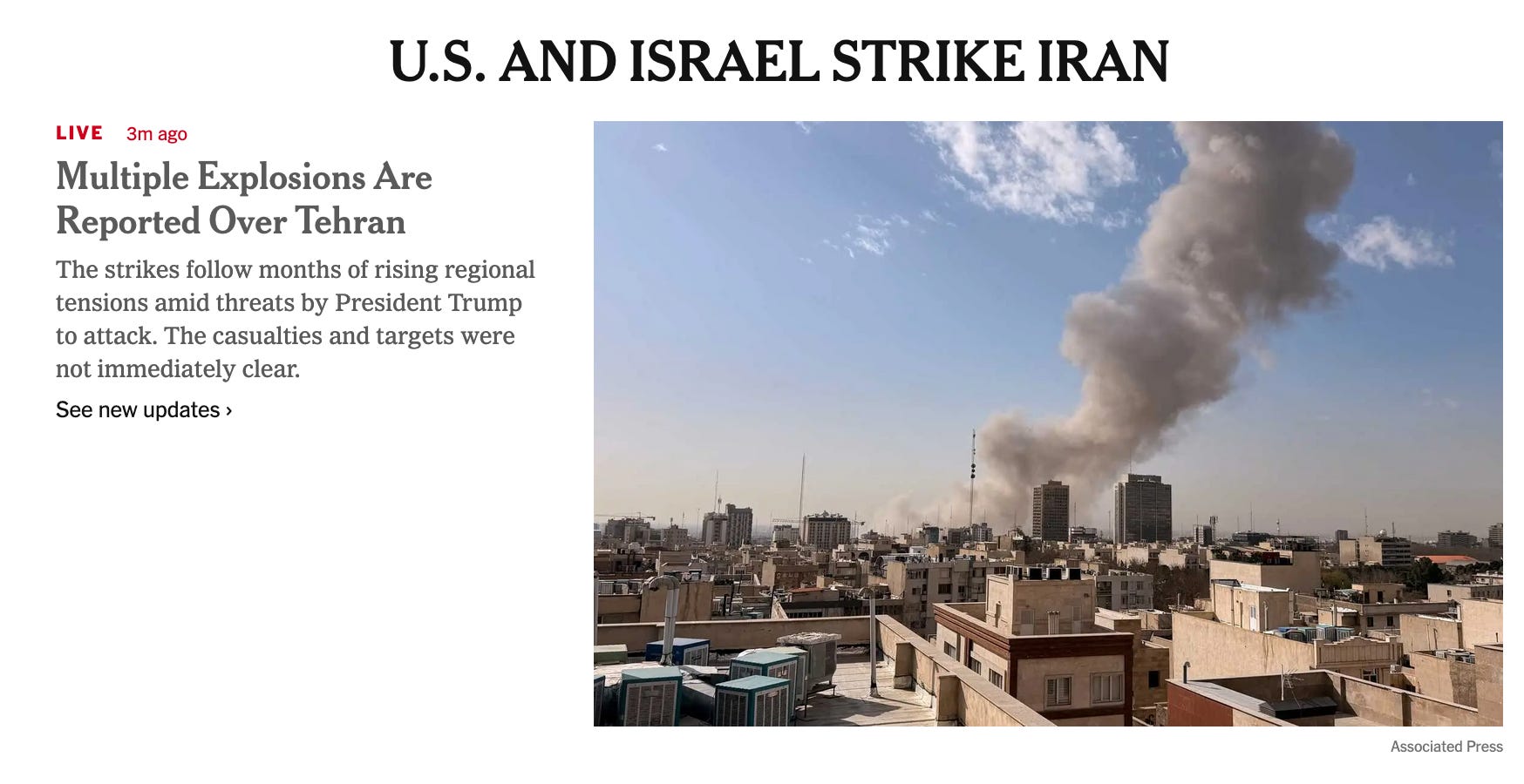 The United States and Israel launched joint strikes on Iran this morning. As I write this, explosions are ripping through Tehran. Smoke is rising from the Supreme Leaderâs compound (I am not making that up). Iranian state media is reporting at least 57 dead students at a girlsâ school in southern Iran (I am also not making that up). My father watched the coverage and pumped his fist like his team just won the Super Bowl.