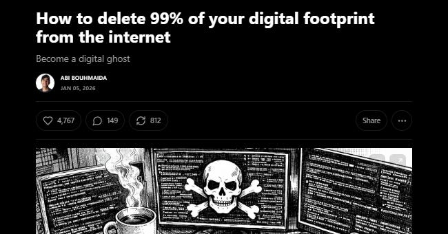 An article has been circulating on Substack about how to delete ninety-nine percent of your digital footprint and become a digital ghost. It has thousands of likes and shares and restacks. The author has four thousand subscribers and this single piece outperformed anything I have ever published despite having sixty thousand people following my work. I read it expecting to find some serious information security content and what I found was a guide so basic and incomplete that anyone who follows it and thinks they have become invisible online is only fooling themselves.